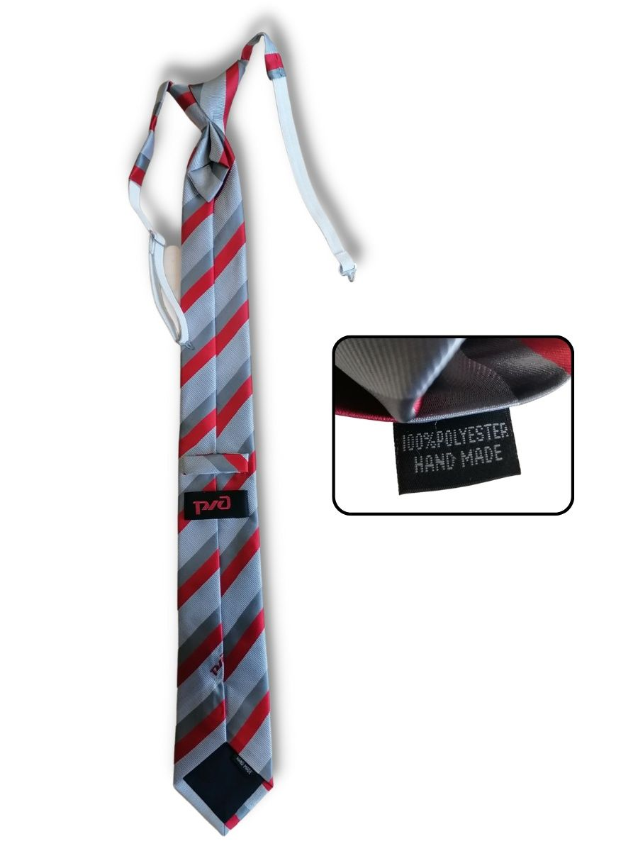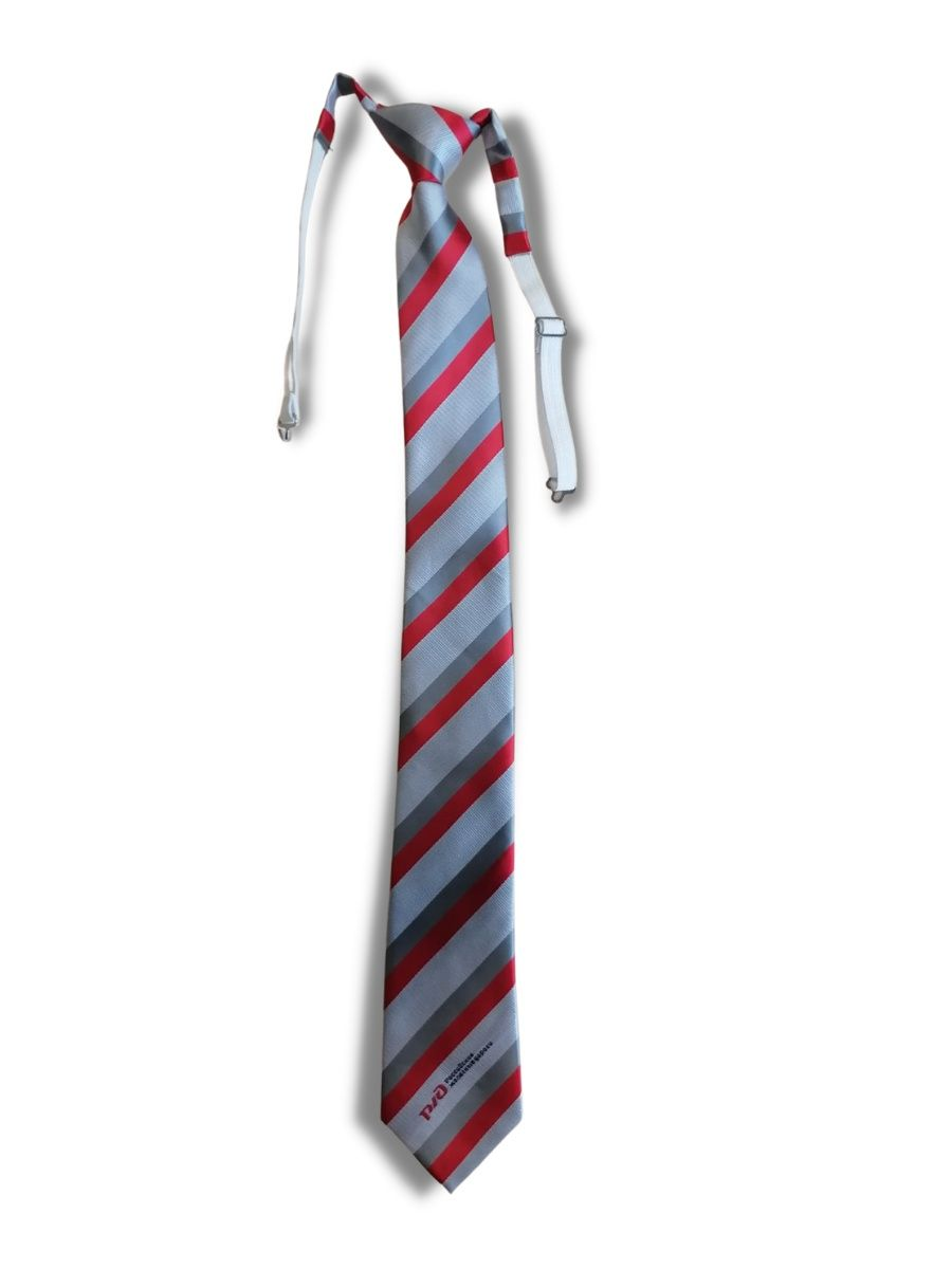 Галстук - регат РЖД для среднего состава нового образца ТУ 2020 года. Галстук РЖД форменный светло-серый с красными и серыми полосками для проводников пассажирских вагонов, состоит из основной детали, узла и шейки. Модель – регат (с резинкой). Шейка галстука состоит из основной ткани, тесьмы эластичной и металлической фурнитуры. Размеры: длина 53 см, ширина низ 7см, верх 4 см. В нижней части галстука расположен логотип РЖД и надпись Российские железные дороги.
