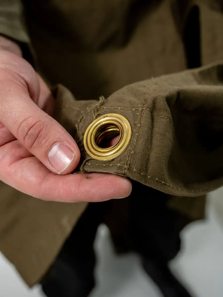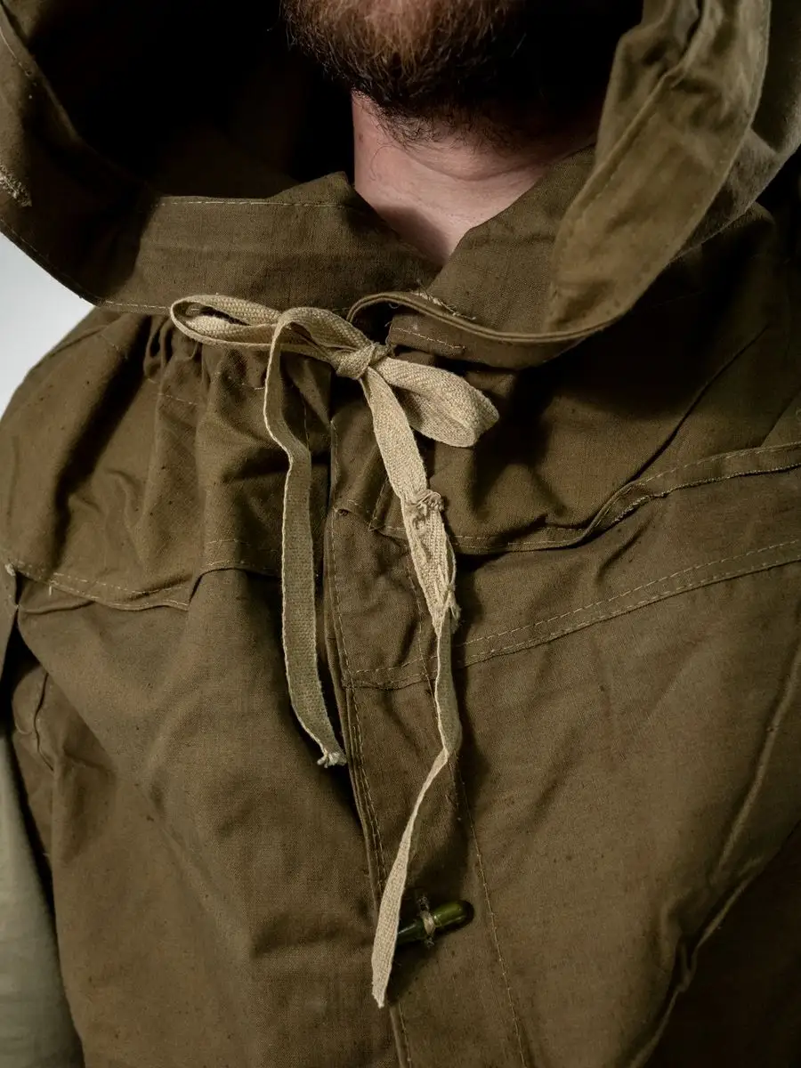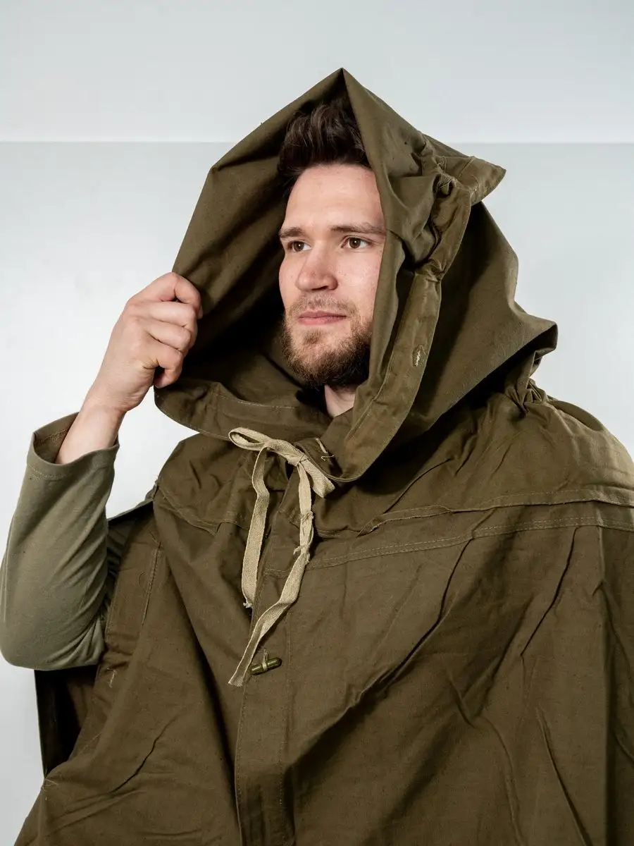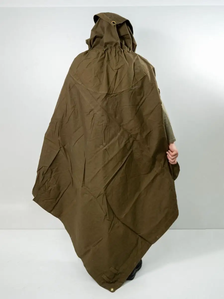 Плащ-палатка солдатская оливковая. Армейская плащ-палатка СССР. Материал брезент (палаточное полотно - очень прочное). Ткань полотно оливкового цвета (хаки). Размер: 180х180см. Свойства: высокая гидрофобность (непромокаемость); высокая огнестойкость; не продуваемость; легкость в переноске. Имеет форму квадрата и собирается в виде плаща с капюшоном и прорезью для правой руки. Нижний угол при этом закрепляется внутри при помощи деревянной пукли, а верхний стягивается шнуром, образуя колпак. Плащ уникальный и многофункциональный элемент армейской экипировки, его можно использовать как: тент, козырьки, укрытия шалашей и открытых окопов, подстилка, прикрываются входы в землянки и шалаши, палатка, плащ-дождевик. Военная плащ палатка может послужить реквизитом на фото сессиях, исторических реконструкциях, для съемок исторического кино, а так же в театральных постановках.